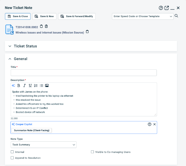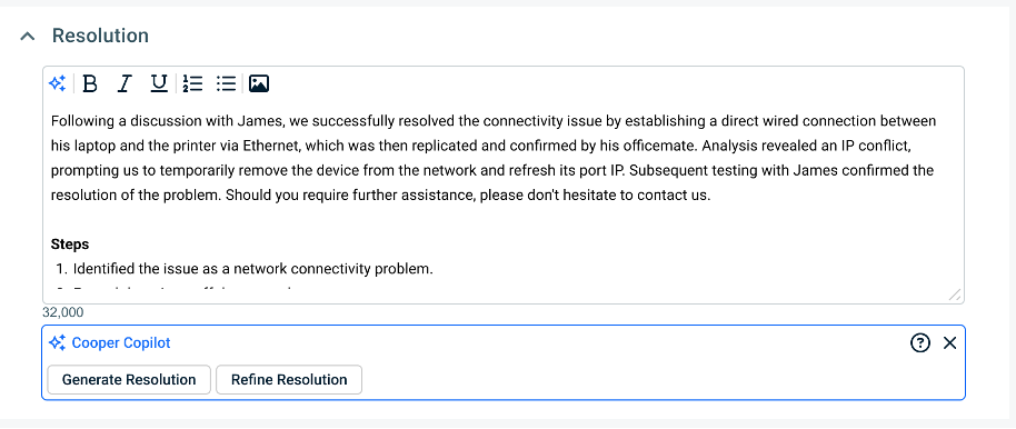 - Simplify wrap-up with Smart Resolution Summary: When a ticket is resolved, documenting the fix and communicating it to the client shouldn’t slow your team down. With Cooper Copilot’s Smart Resolution Summary, technicians can instantly generate a detailed, step-by-step summary based on the ticket’s activity. Prefer to write it yourself? Use the same AI-powered writing assistant to polish your notes for client-ready communication. Whether auto-generated or refined, these summaries help build a reliable knowledge base, support audit readiness and enable junior techs to confidently handle more advanced issues in the future.