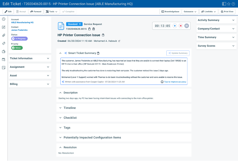 - Simplify wrap-up with Smart Resolution Summary: When a ticket is resolved, documenting the fix and communicating it to the client shouldn’t slow your team down. With Cooper Copilot’s Smart Resolution Summary, technicians can instantly generate a detailed, step-by-step summary based on the ticket’s activity. Prefer to write it yourself? Use the same AI-powered writing assistant to polish your notes for client-ready communication. Whether auto-generated or refined, these summaries help build a reliable knowledge base, support audit readiness and enable junior techs to confidently handle more advanced issues in the future.