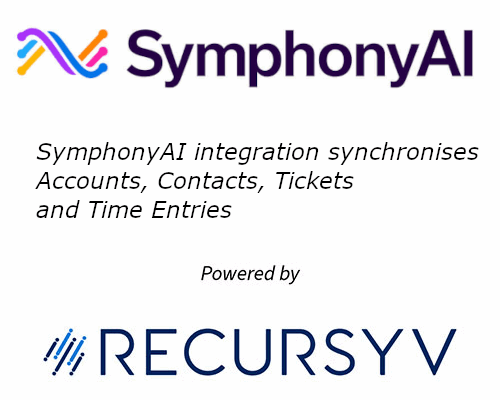 Connect Autotask to SymphonyAI using this templated Recursyv integration. The integration allows you to synchronize Autotask & SymphonyAI Contacts, Tickets, Ticket Notes, Ticket Attachments and Time Entries. The scope can be easily extended to include additional data types, UDFs, list values and mappings.