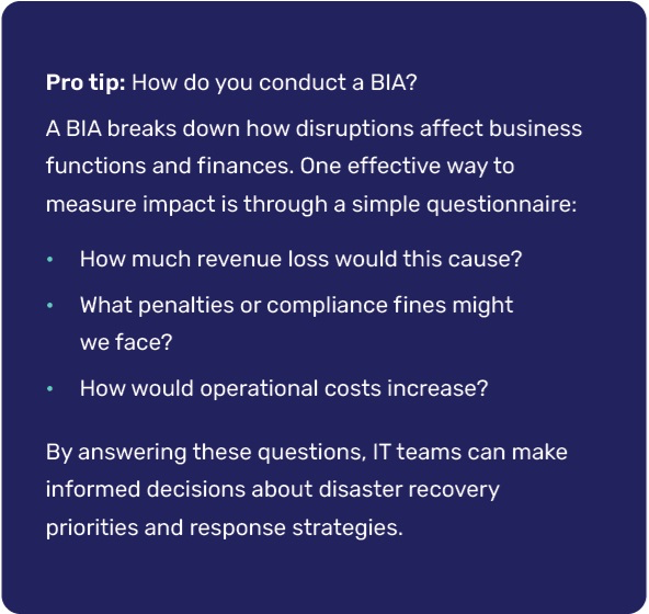 A BIA helps you identify the critical functions a business depends on and what happens if they go down. It provides a clear picture of operational, financial and reputational impacts.