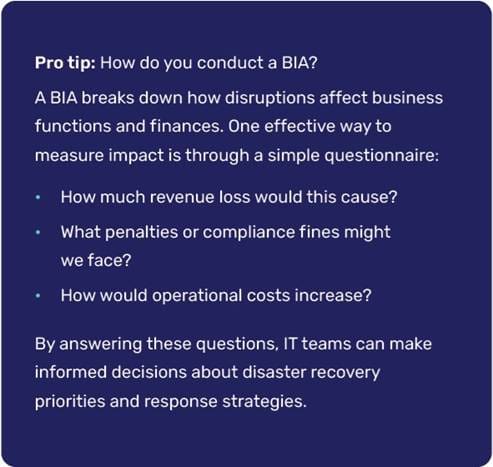 2. Conduct a business impact analysis (BIA): Next, evaluate how different types of disruptions affect your operations. A BIA helps you pinpoint which systems, applications and services are mission-critical, and what the consequences are if they go down. This step helps prioritize recovery efforts and ensures resources are allocated where they’re needed most.